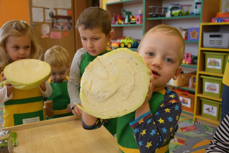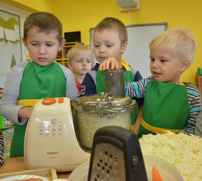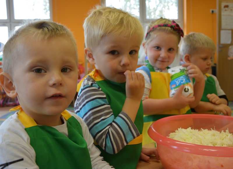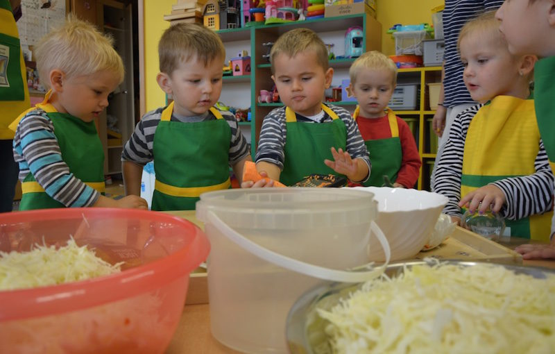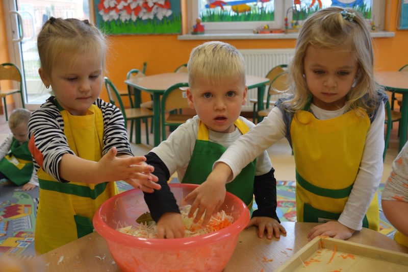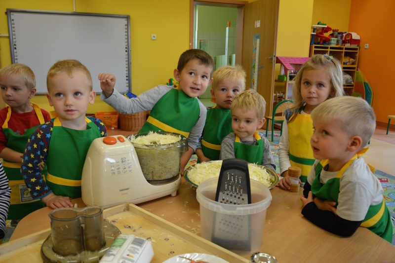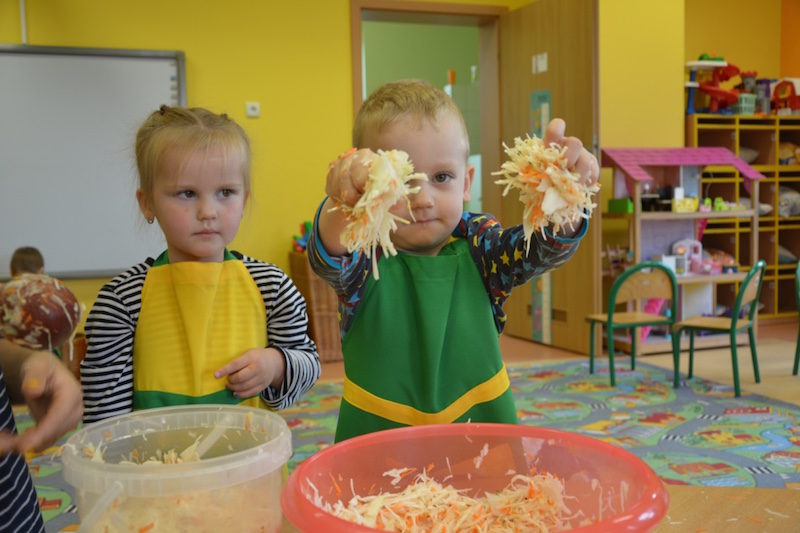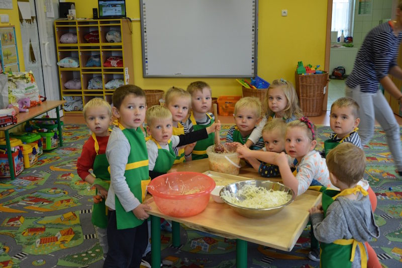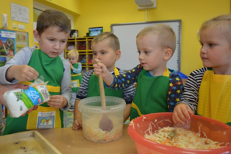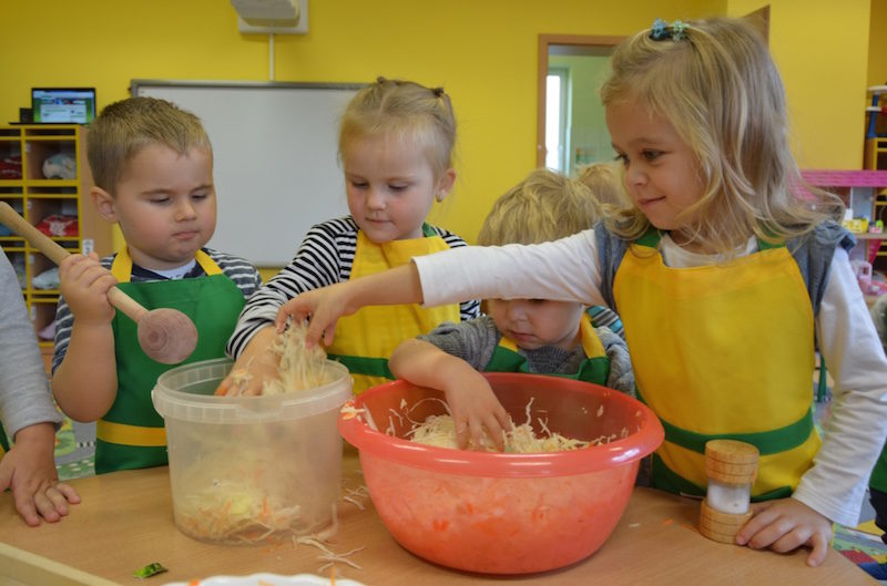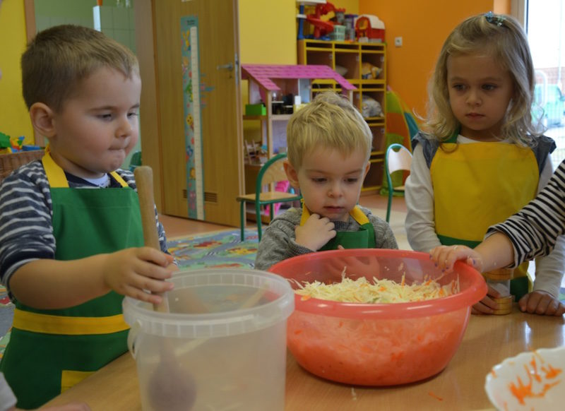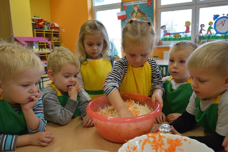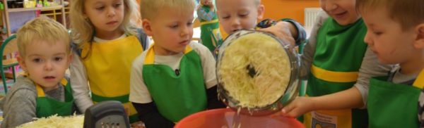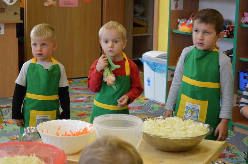 W ramach realizacji tematu „Zapasy na zimę”, małe Zuchy uczestniczyły w zajęciu kulinarnym – kiszenie kapusty. Dzieci miały okazje poznać kapustę wszystkimi zmysłami (wzrok, smak, zapach, dotyk). Po lekcji wstępu i po przedstawieniu przepisu na kiszenie kapusty nadszedł czas na działanie. Wszystkie dzieci ochoczo rwały się do pracy – jedni obierali marchewki a inni już czekali z przyprawami. Wszyscy wspólnie mocno mieszali składniki by na końcu kapustę umieścić w „beczce”. Miejmy nadzieję, że niedługo zjemy ją do obiadu jako surówkę.
