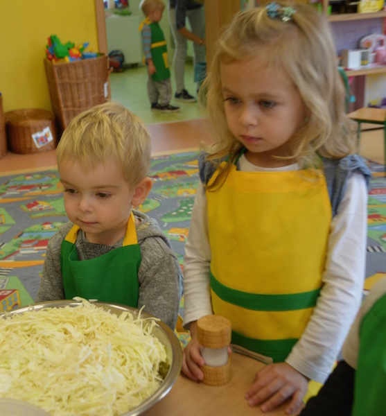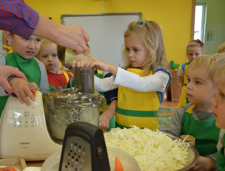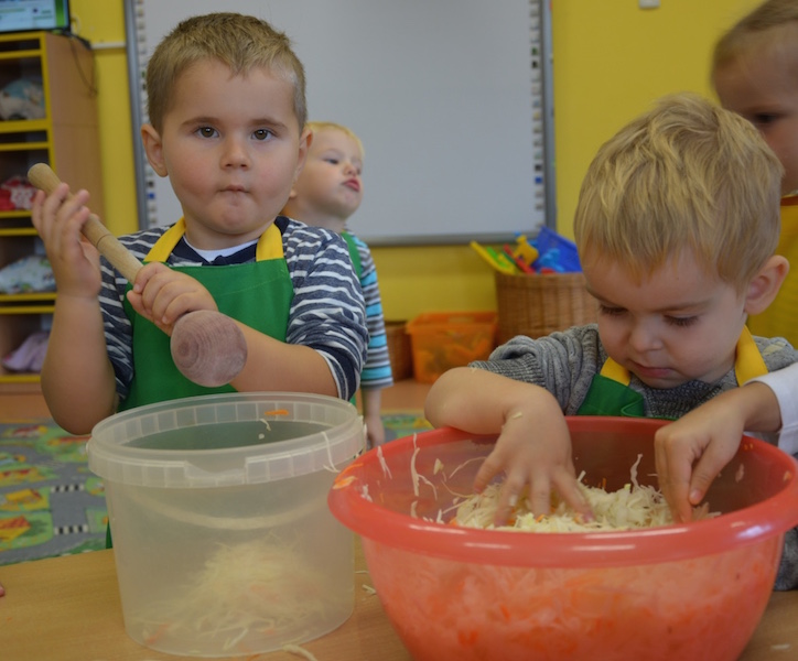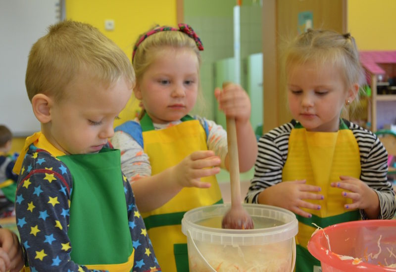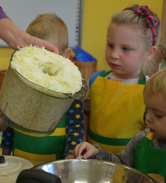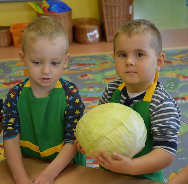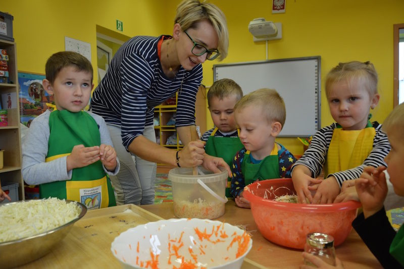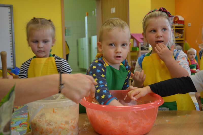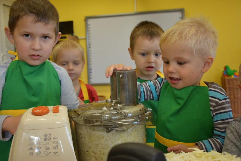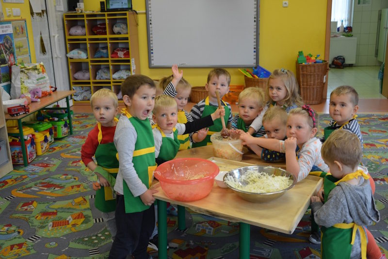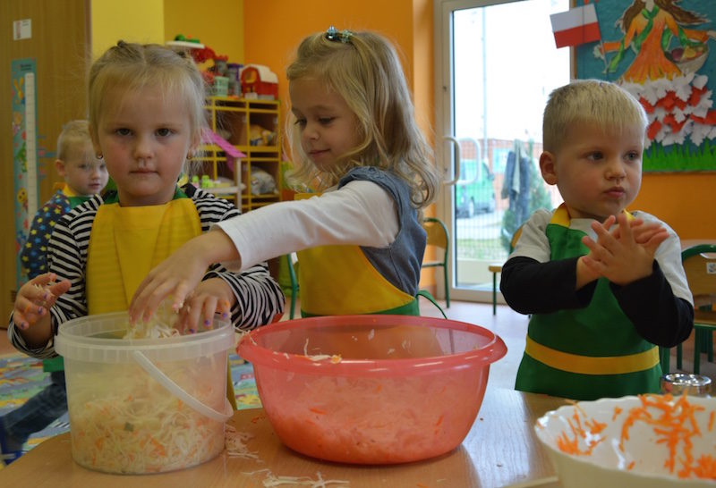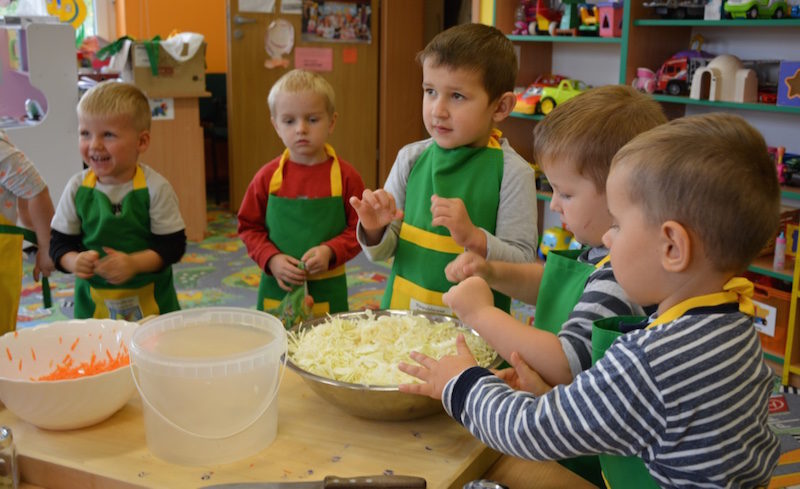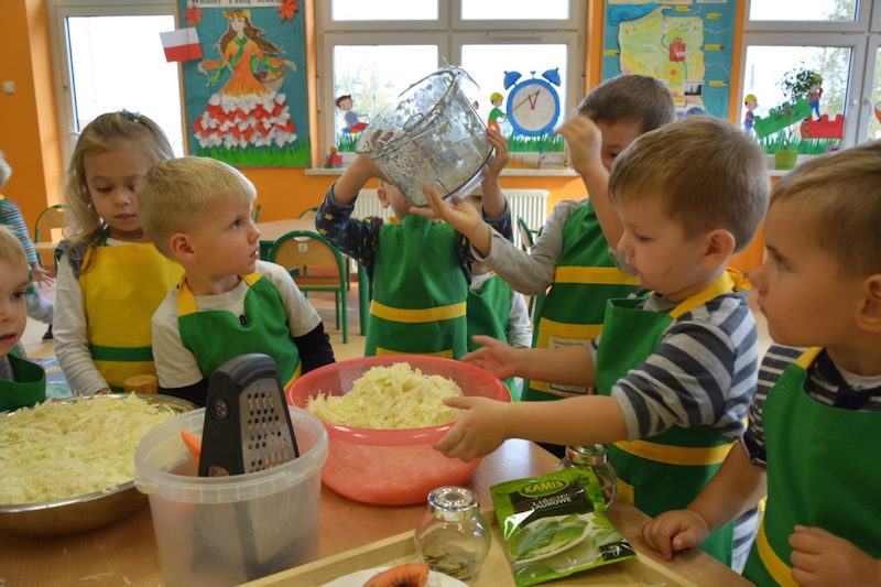 W ramach realizacji tematu „Zapasy na zimę”, małe Zuchy uczestniczyły w zajęciu kulinarnym – kiszenie kapusty. Dzieci miały okazje poznać kapustę wszystkimi zmysłami (wzrok, smak, zapach, dotyk). Po lekcji wstępu i po przedstawieniu przepisu na kiszenie kapusty nadszedł czas na działanie. Wszystkie dzieci ochoczo rwały się do pracy – jedni obierali marchewki a inni już czekali z przyprawami. Wszyscy wspólnie mocno mieszali składniki by na końcu kapustę umieścić w „beczce”. Miejmy nadzieję, że niedługo zjemy ją do obiadu jako surówkę.