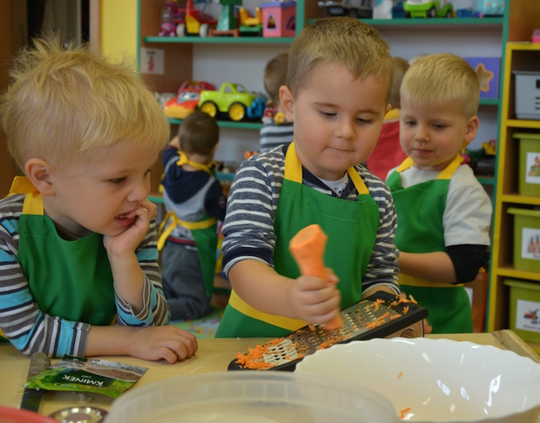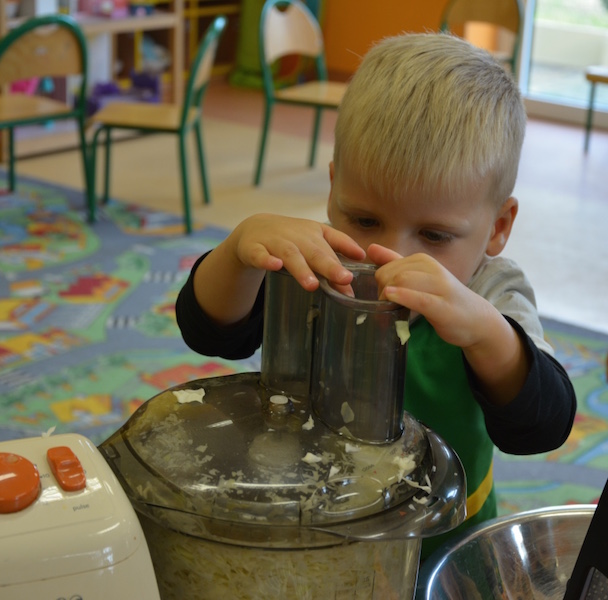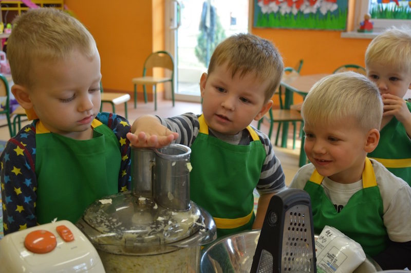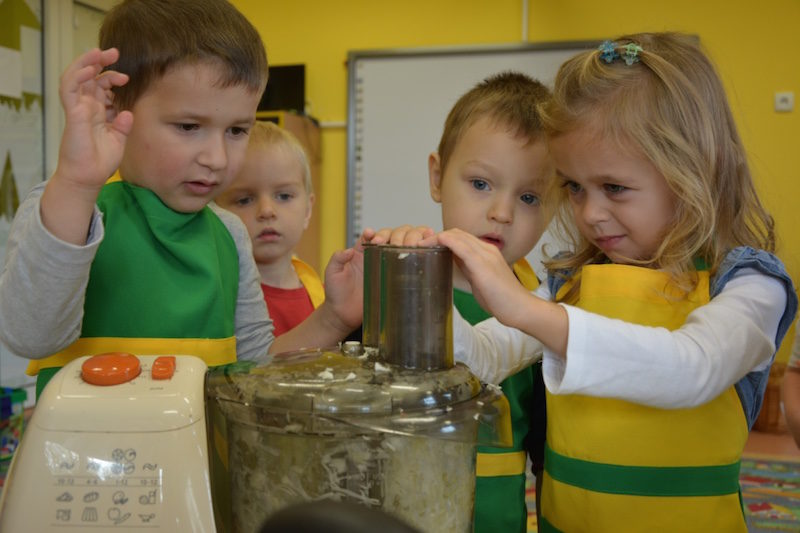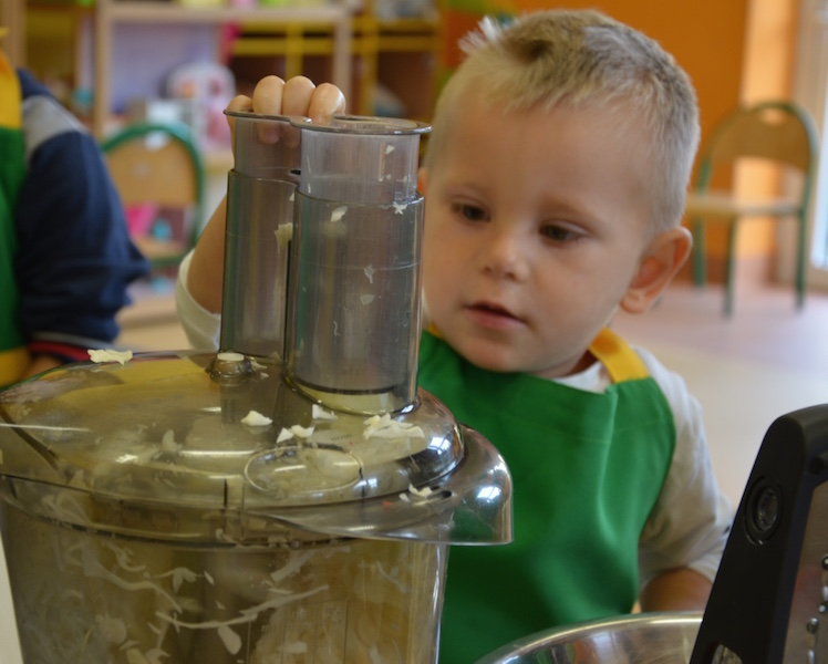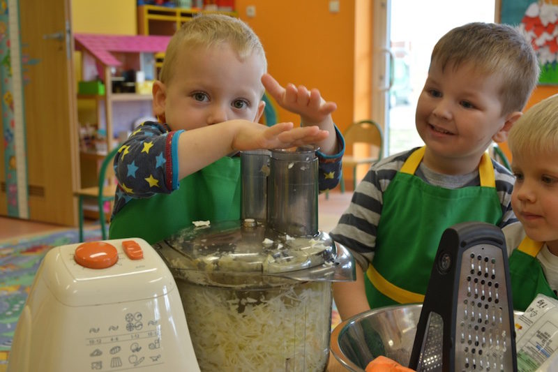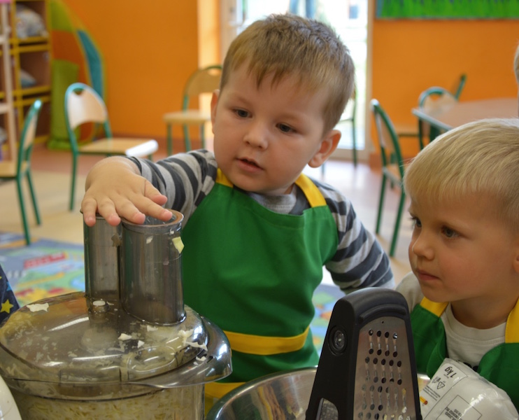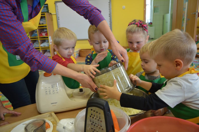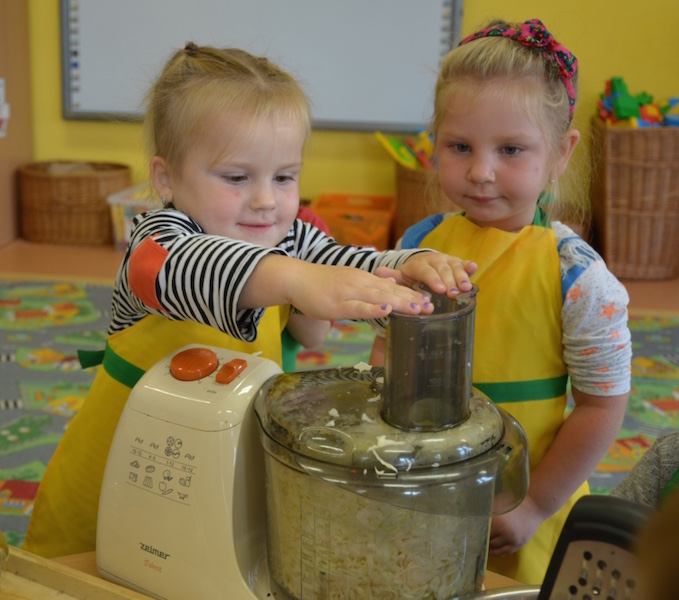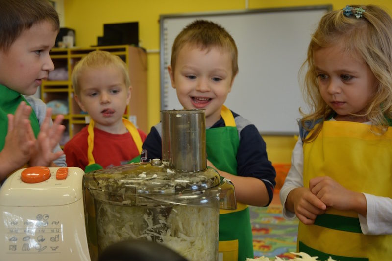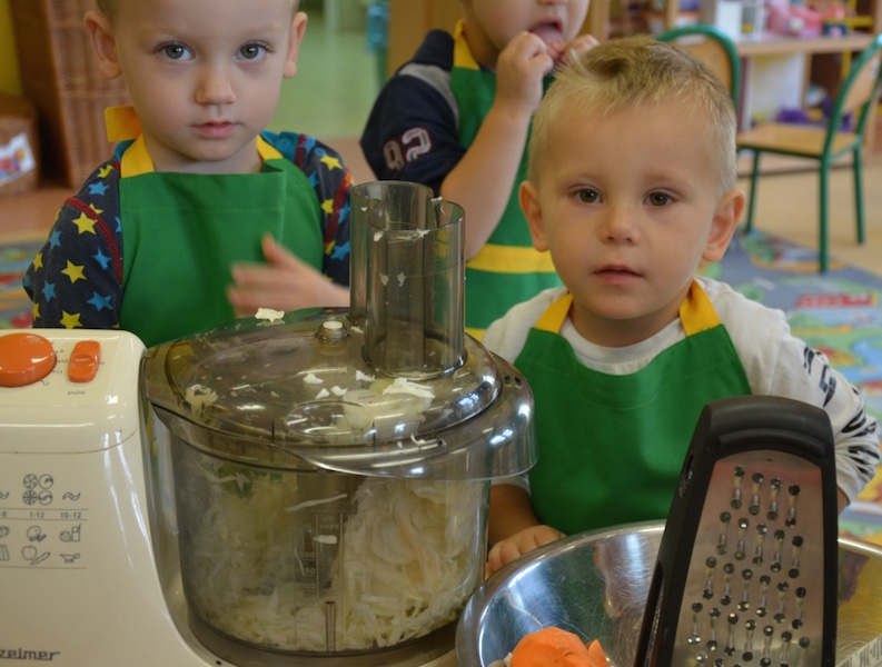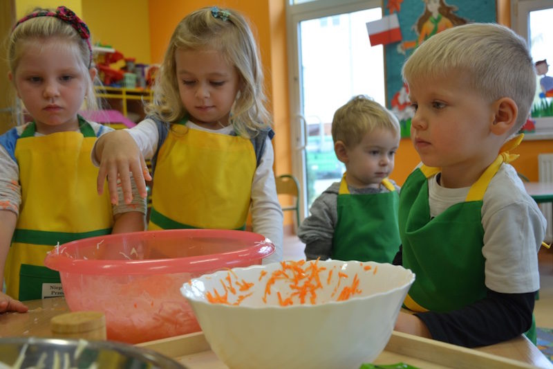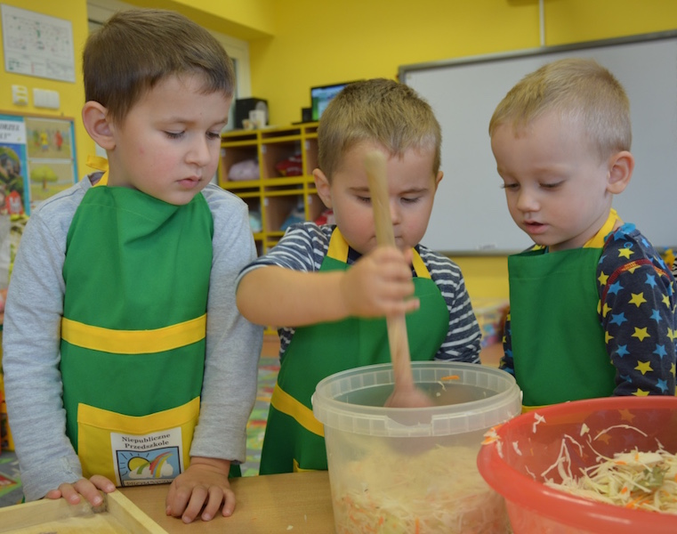 W ramach realizacji tematu „Zapasy na zimę”, małe Zuchy uczestniczyły w zajęciu kulinarnym – kiszenie kapusty. Dzieci miały okazje poznać kapustę wszystkimi zmysłami (wzrok, smak, zapach, dotyk). Po lekcji wstępu i po przedstawieniu przepisu na kiszenie kapusty nadszedł czas na działanie. Wszystkie dzieci ochoczo rwały się do pracy – jedni obierali marchewki a inni już czekali z przyprawami. Wszyscy wspólnie mocno mieszali składniki by na końcu kapustę umieścić w „beczce”. Miejmy nadzieję, że niedługo zjemy ją do obiadu jako surówkę.