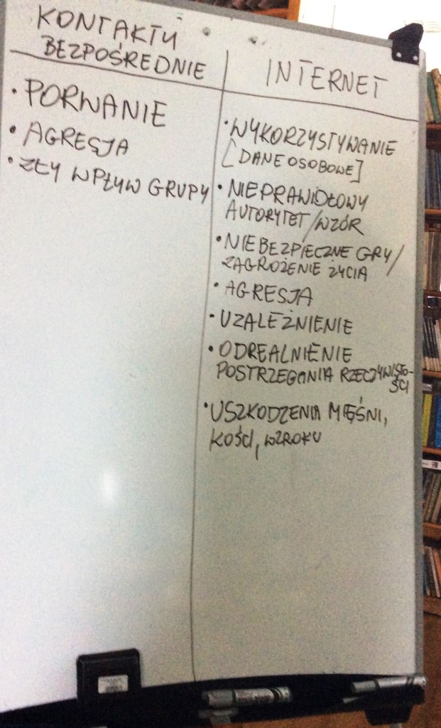 Majowe spotkanie z Panią pedagog Elżbietą Pyzińską poświęcone było Bezpieczeństwu naszych dzieci, w szczególności zasadom, jakie powinny obowiązywać podczas korzystania z komputerów i Internetu. Rodzice tworzyli własny katalog zagrożeń, które mogą spotkać ich pociechy w świecie wirtualnym. Znalazły się wśród nich: możliwość wykorzystania dzieci i ich łatwowierności wobec obcych osób, szukanie wzorców i autorytetów w sieci, możliwość kontaktu z niebezpiecznymi grami i stronami, agresja, uzależnienie, a także problemy z prawidłowym postrzeganiem świata realnego i zdrowotne. Poznaliśmy sposoby radzenia sobie z wieloma problemami dotyczącymi opiekunów, którzy borykają się z problemem nadużywania mediów przez podopiecznych, a także zasady, jakie powinny towarzyszyć naszym pociechom, gdy korzystają z urządzeń mobilnych. Próbowaliśmy także, podczas dyskusji, znaleźć „sposoby na tablet”, które moglibyśmy „wypróbować” we własnych rodzinach. Na koniec z ciekawością obejrzeliśmy film „Homo tabletis” poruszający problem korzystania z tabletów przez malutkie dzieci.