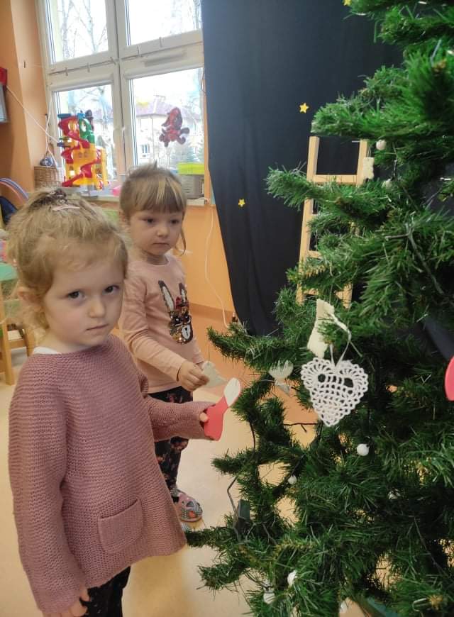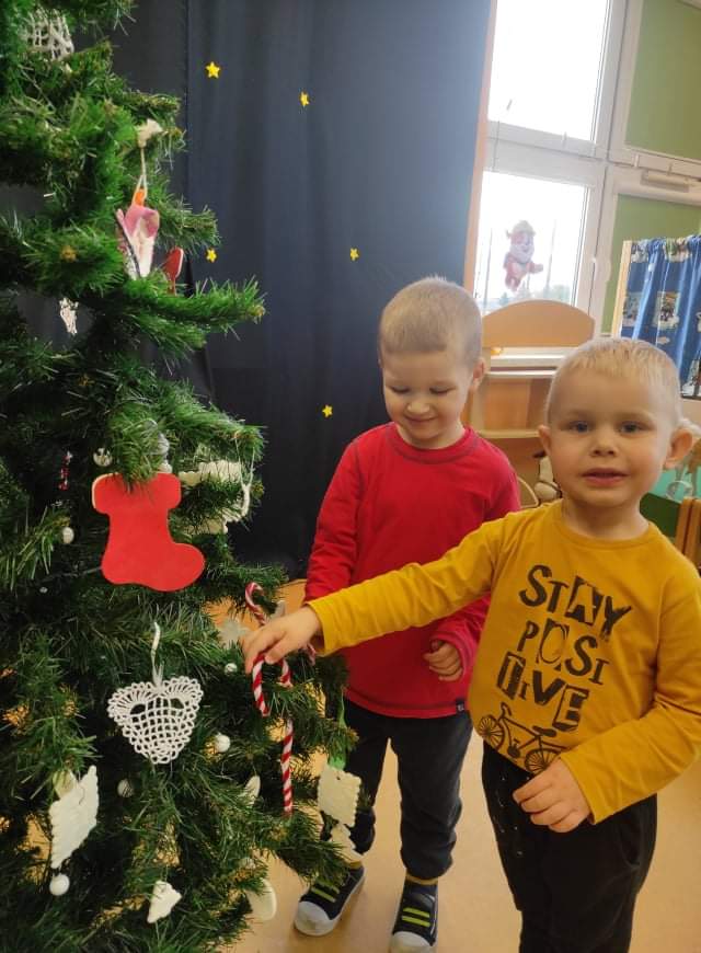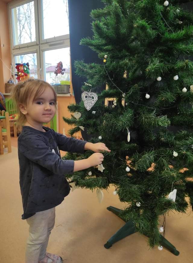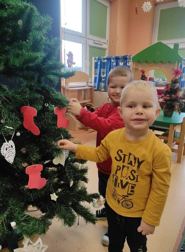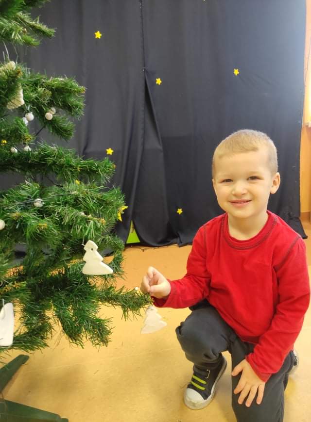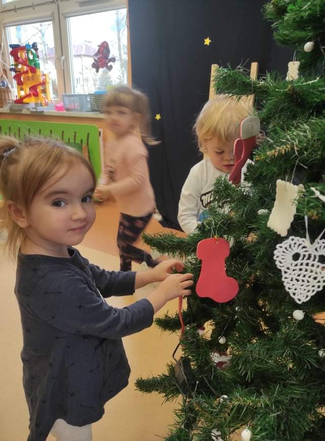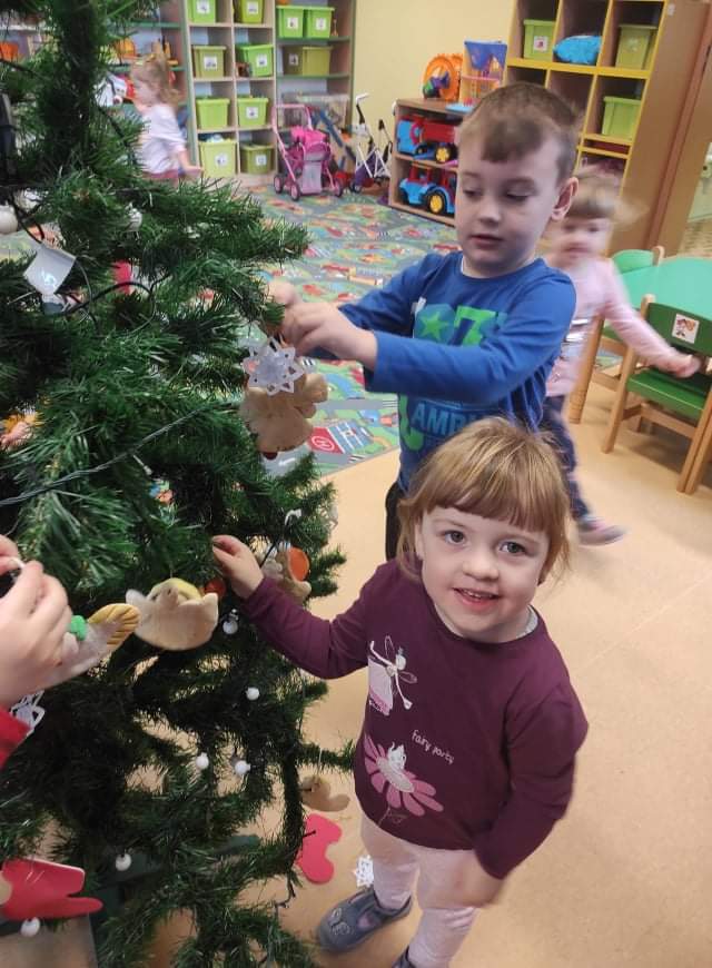 Czas Świąt Bożego Narodzenia wiąże się z tradycją ubierania świątecznego drzewka. W naszym przedszkolu również nie mogło zabraknąć tego rytuału. Tuż przed wizytą św. Mikołaja – długo oczekiwanego gościa przedszkolaki z grupy z wielkim zapałem zabrały się do ubierania choinki. Zawieszały bombki, gwiazdki, łańcuchy, kolorowe światełka. W sali od razu zrobiło się świątecznie.