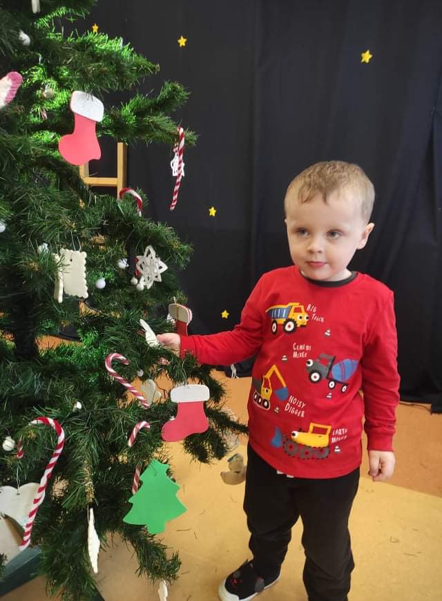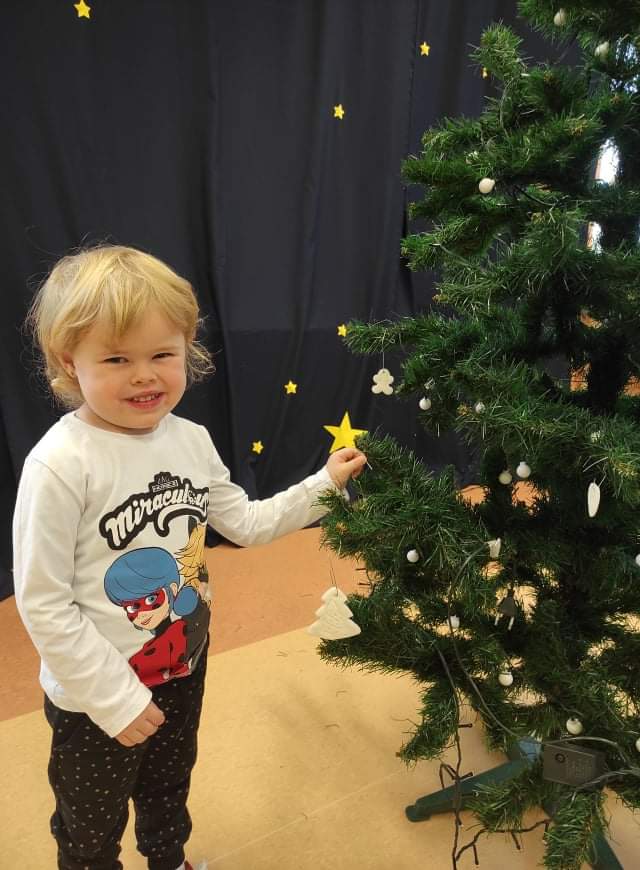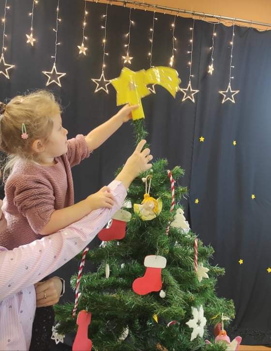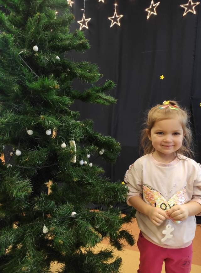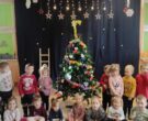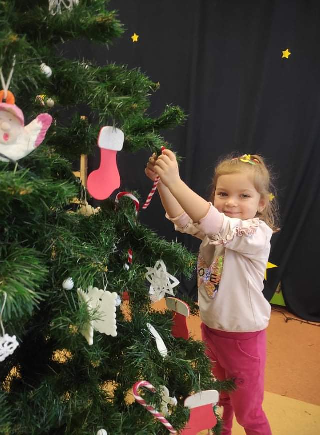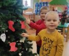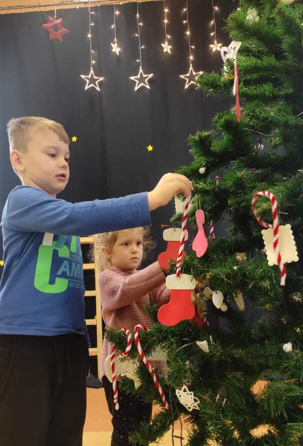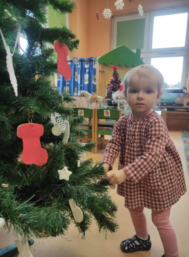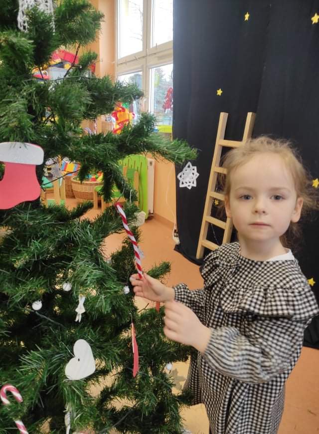 Czas Świąt Bożego Narodzenia wiąże się z tradycją ubierania świątecznego drzewka. W naszym przedszkolu również nie mogło zabraknąć tego rytuału. Tuż przed wizytą św. Mikołaja – długo oczekiwanego gościa przedszkolaki z grupy z wielkim zapałem zabrały się do ubierania choinki. Zawieszały bombki, gwiazdki, łańcuchy, kolorowe światełka. W sali od razu zrobiło się świątecznie.